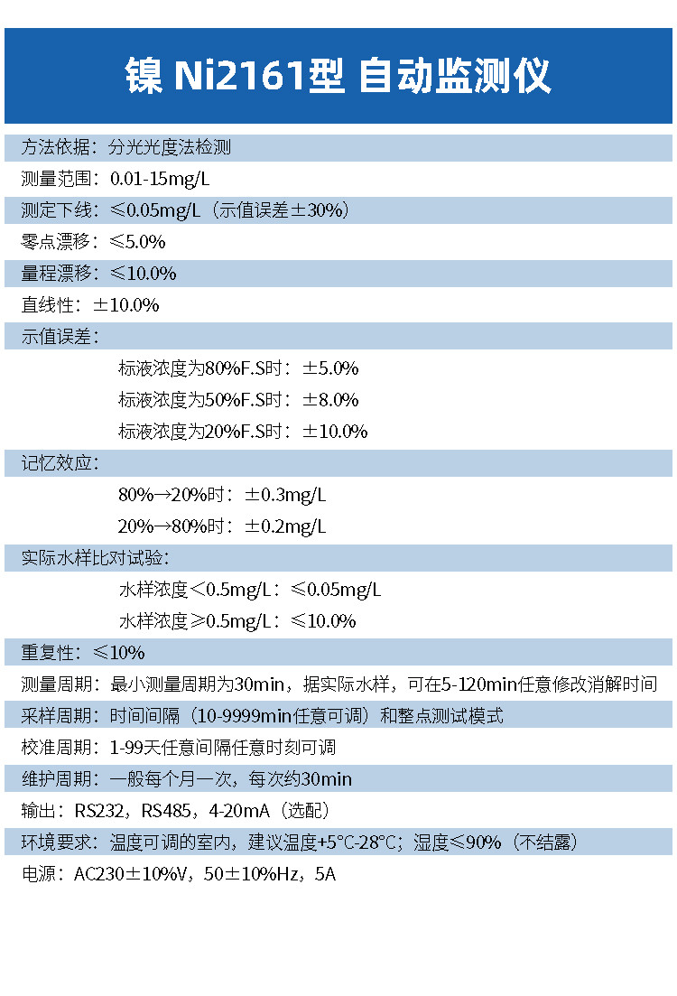 水样和调节剂混合后,镍离子在氨性环境和指示剂存在的情况下,与指示剂反生成一种带色络合物, 分析仪检测此颜色的变化,并把这种变化换算成镍离子值输出来。生成的带色络合物量相当于镍离子量。