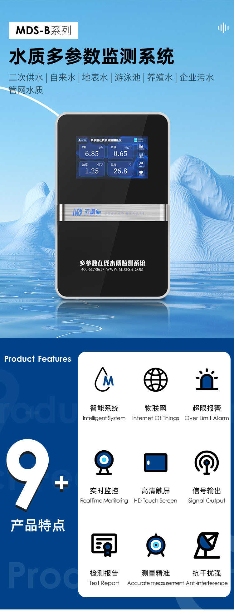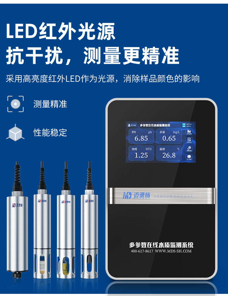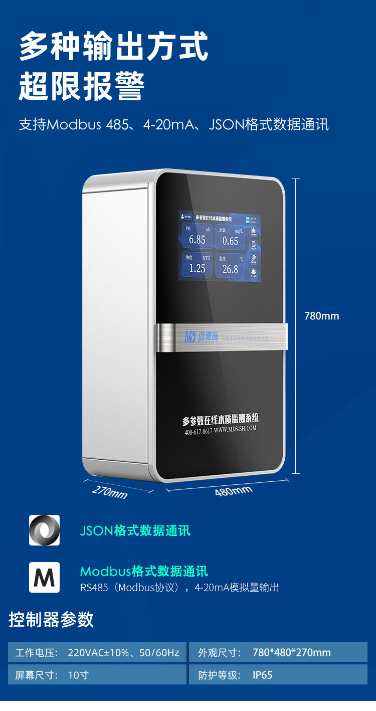 五参数在线分析仪由控制器、pH传感器、电导率传感器、溶解氧传感器、浊度传感器组成。控制器可同时接入4个传感器,同时有模拟量、数字量、开关量等多种输出接口。