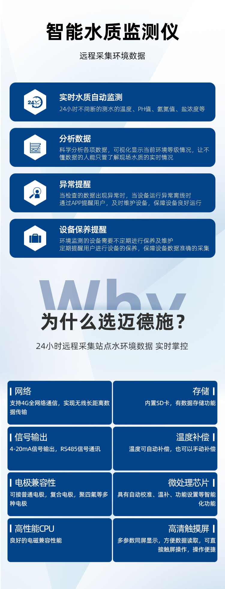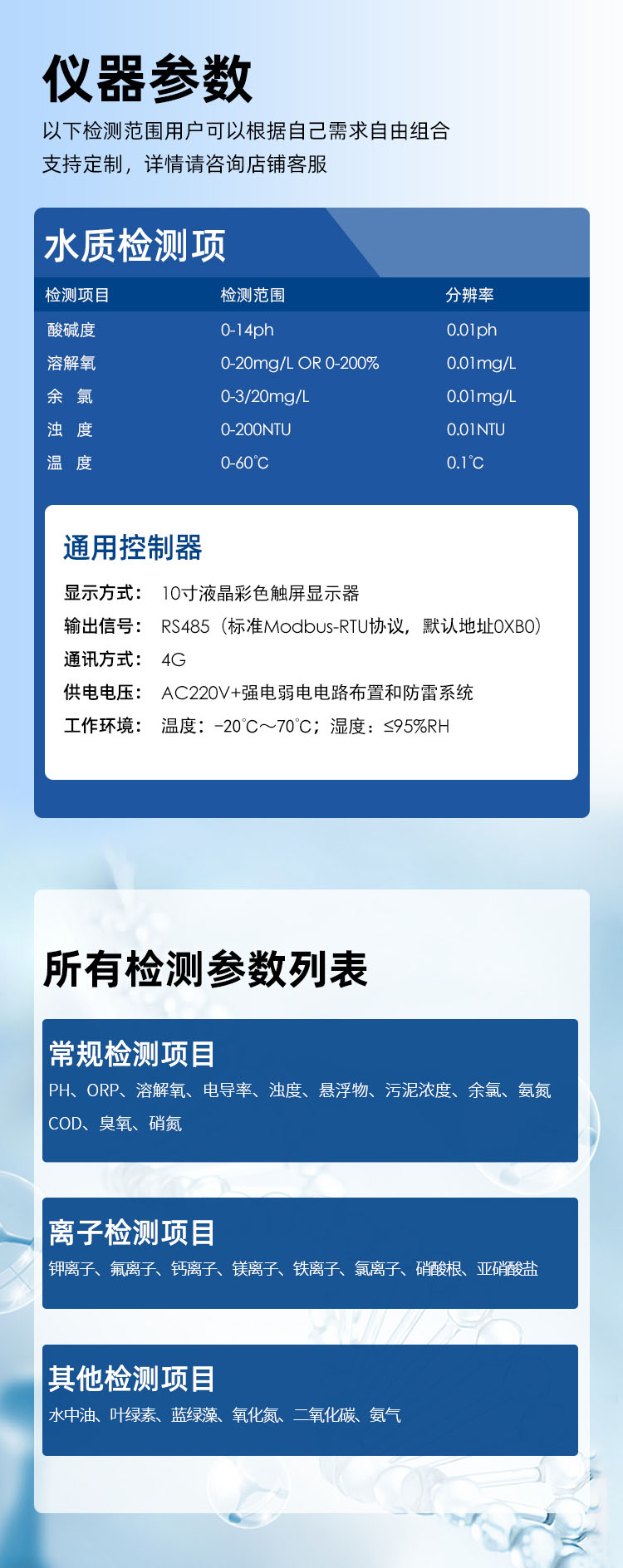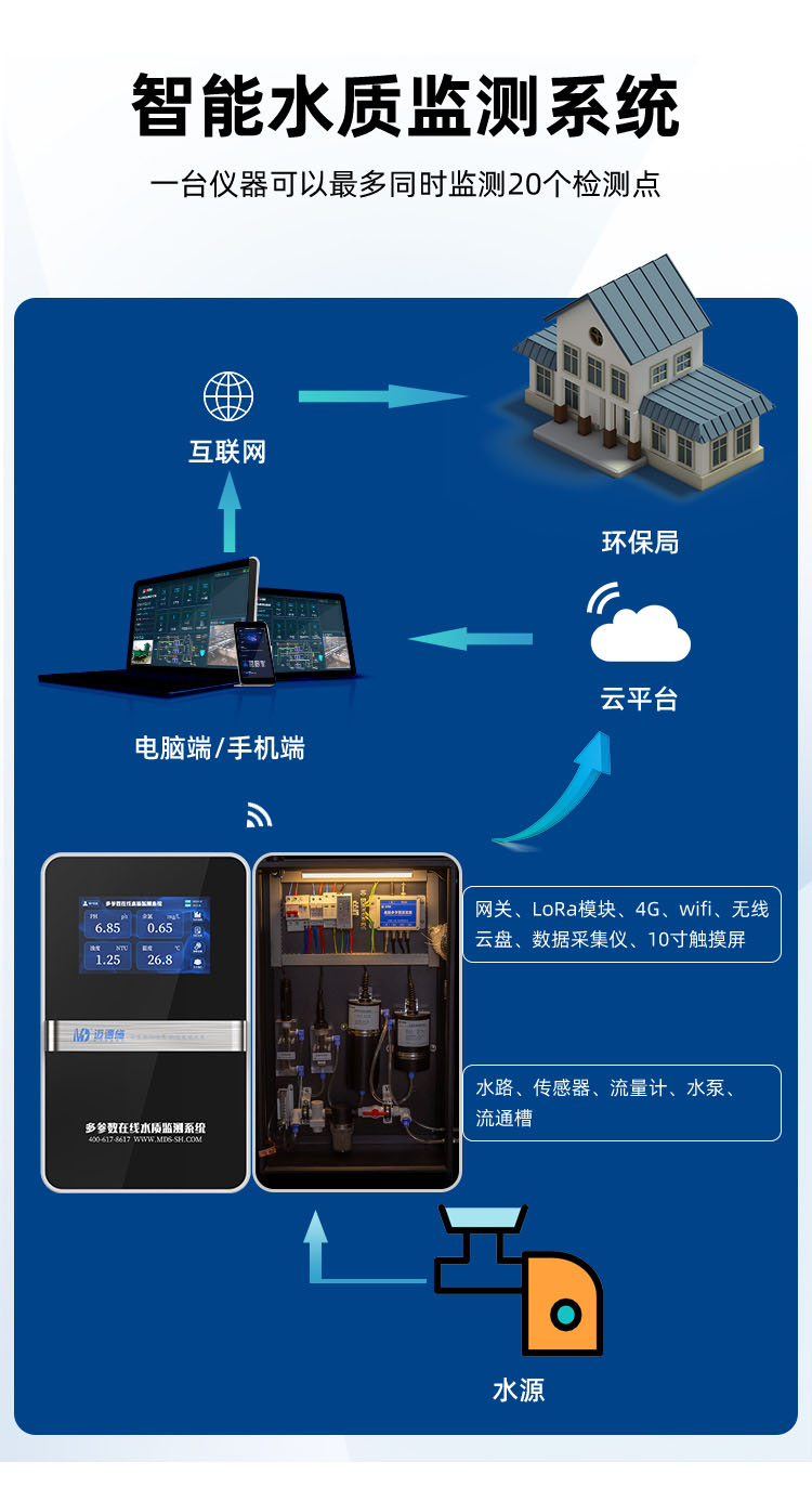 五参数在线分析仪由控制器、pH传感器、电导率传感器、溶解氧传感器、浊度传感器组成。控制器可同时接入4个传感器,同时有模拟量、数字量、开关量等多种输出接口。
